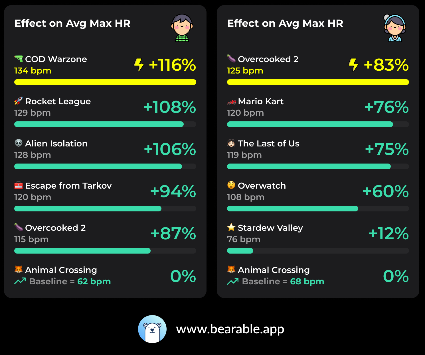 [OC] My GF and I experimented tracking the average effect of Video Games on our Maximum Heart Rate. These were the 5 most significant increases. Submitted by HeroJournal t3_10demye on January 16, 2023 at 1:32 PM in dataisbeautiful No comments 2